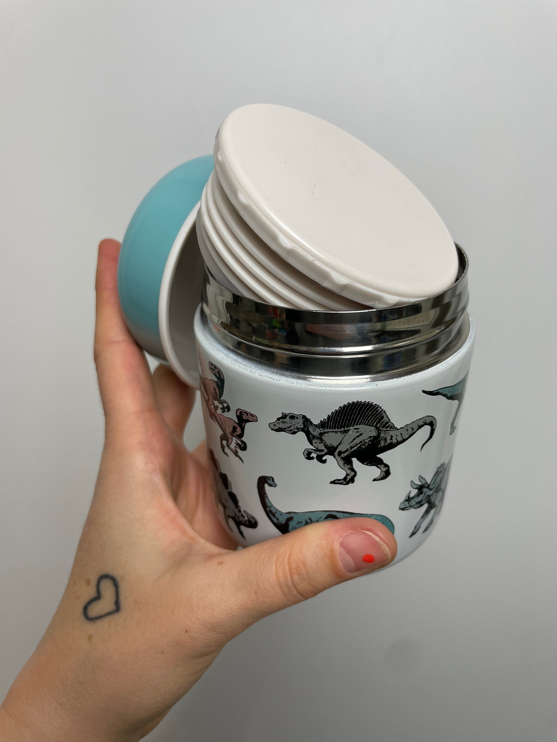 Eine isolierter Thermos Behälter für Kinder, bedruckt mit den schönen Dinos aus dem Prehistoric Land - Design.